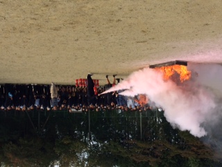 実際に消火器を使って、消火器の使用の仕方や消火する際の注意点などを学びました。