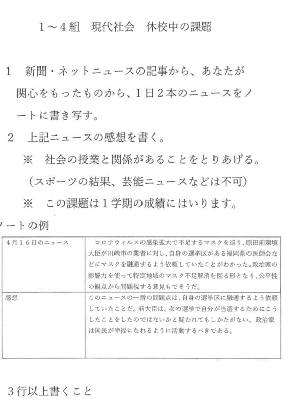 5月6日までの休業期間の課題を、4月17日(金)に提示しましたが、連絡が間に合わなかった課題も載せますので再度確認してください。