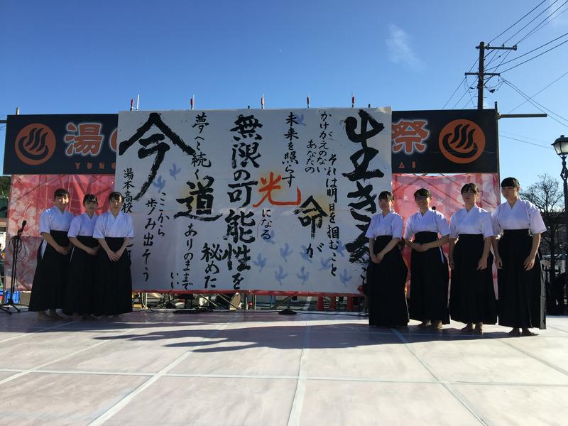 私たち書道班は、展覧会への出品はもちろん、イベントなどで発表する書道パフォーマンスも行っています。書道パフォーマンスは、みんなで作品を作り上げるものです。どんな言葉を伝えたいのか、背景の柄は何がよいか、どの文字を大きくしたいかなど皆で意見を出し合いながら決めていきます。限られた時間の中でどれだけ練習できるかが大切なので一文字でも多く書けるよう、一人一人が集中して取り組んでいます。また、初心者でも納得のいく文字がかけるように、基本的な練習もしっかりやっています。見てくださる方の心と私たちの言葉をつなげられるように、また楽しめる作品を作れるように、これからも頑張ります。