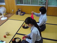 日本文化部茶道班です。私たちは毎週木曜日、さはこ会館2Fで活動をしています。日々の活動は、お手前のお稽古や礼儀作法を学ぶことです。毎年7月と12月には、発表会に参加し、市内の高校茶道部の前でお点前を披露します。部員随時募集中です。是非、木曜日放課後に、さはこ会館に足を運んでください。
